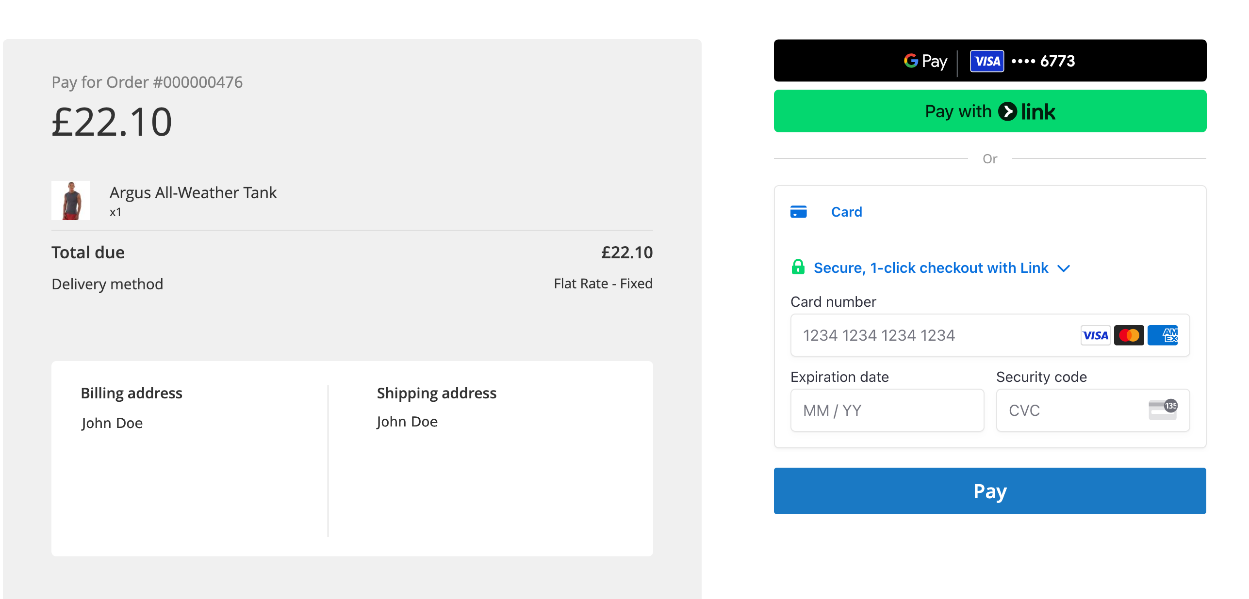 - Checkout Form from checkout, supporting direct Credit/Debit card, Apple Pay, Google Pay and Stripe Link.